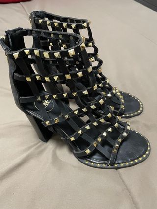 Elegantes zapatillas de tacón con un diseño de tiras entrecruzadas y adornos metálicos. - Tacón grueso y cuadrado. - Cierre de cremallera en la parte trasera. - Diseño tipo gladiador. - Tachuelas doradas en toda la estructura. Estado: usada en 3 o 4 ocasiones. Comprada en una tienda de zapatos de Dublín.