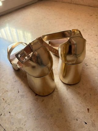 Elegantes tacones dorados con plataforma y tacón cuadrado. - Diseño de tiras. - Cierre de hebilla. - Acabado brillante. Tamaño del tacon 7.6