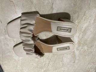 Mules en piel sintética con tiras anchas acolchadas y puntera cuadrada abierta. Forro de punto y plantillas en piel sintética. Tacón cuadrado revestido 8 cm. Solo usadas un día, como nuevas. Son muy muy cómodas y ponibles.