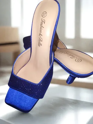 Sandalias de tacón con un diseño moderno y elegante. - Tira delantera adornada con pedrería. - Tacón fino y cómodo. - Punta cuadrada.