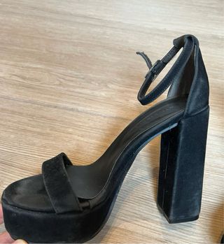 Sandalias de fiesta con plataforma y tacón alto, nuevas para estrenar. - Diseño elegante en color negro. - Tira de sujeción al tobillo. - Tacón grueso y cuadrado. - Plataforma delantera pronunciada.