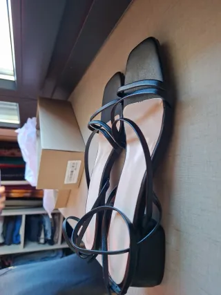 Sandalias negras con tiras finas que se anudan al tobillo. - Diseño elegante y minimalista. - Punta cuadrada. - Tiras finas para atar.