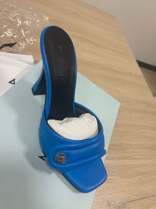 Elegantes zapatos de la marca MYRIA en talla 38. Un diseño moderno y llamativo. - Color azul vibrante. - Detalle metálico en la pala. - Diseño abierto tipo sandalia.