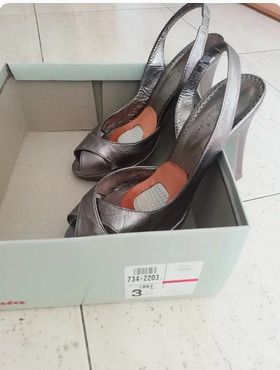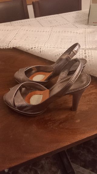 Sandalias del n. 36, color plateado-cobre. Han tenido muy poco uso. Tacones de 10 cm. Llevan unas plantillas pegadas que se pusieron para caminar más cómodamente, por lo demás están como nuevas. Marca Bata. Se entregan en la caja original. - Acabado metalizado plateado. - Tira trasera para ajuste. - Tacón fino.