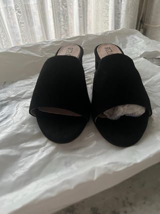 Elegantes sandalias de ante, color negro, sin estrenar. Marca Cortefiel. Muy cómodas. Cierre con hebilla lateral. Tacón muy elegante, con forma rectangular. Altura del tacón: 7,5 cm. Las vendo porque me encantaron y me compré un número más grande porque no tenían el 37 y me bailan... - Material: Ante - Color: Negro - Talla: 38 Ideal ceremonia o para ir elegante a diario.
