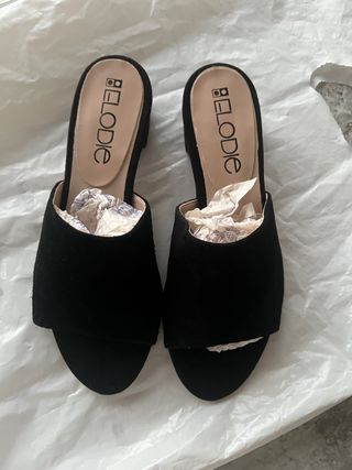 Sandalias tipo mules, de piel con tacón cómodo. De la marca Elodie. Fabricados en España. Color negro - Diseño abierto. - Tacón grueso.
