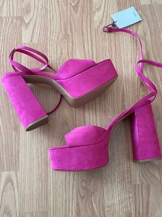Sandalias de tacón alto con plataforma y pulsera al tobillo. - Material: Ante sintético. - Color: Fucsia vibrante. - Diseño: Punta abierta y tiras finas. - Tacón grueso de 12 cm y plataforma cómoda. - Cierre de hebilla.
