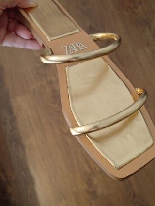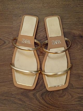 Elegantes sandalias planas de Zara en color dorado de piel. - Diseño con dos tiras doradas. - Suela fina, sin tacón. Usadas solo una ocasión. Las vendo porque me quedan un poco pequeñas.