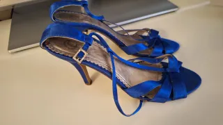 Elegantes sandalias de tacón con detalle de lazo y acabado en raso. - Material: Raso - Color: Azul - Talla: 38 - Diseño con tiras y cierre de hebilla - Tacón fino Puestas en dos ocasiones Ideal boda eventos.... Hago envio