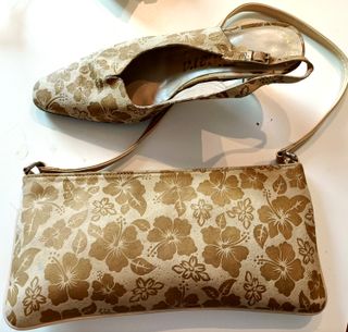 Preciosas sandalias y bolso de mano a juego, en color beige. Ideales para un look elegante y sofisticado. Tacon de 7 cms. - Sandalias de tacón con diseño floral. - Bolso de mano con correa, estilo bandolera. - Ambos en perfecto estado.