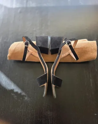 Elegantes sandalias de tacón con un diseño moderno. - Tallas disponibles: 37, 38, 39, 40. - Combinación de colores negro y dorado. - Acabado en ante.