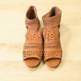 Elegantes sandalias de tacón con un diseño abierto y tiras entrelazadas. - Material: Cuero - Color: Marrón - Estilo: Sandalia peep-toe con tiras - Cierre: Correa ajustable al tobillo