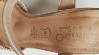 Sandalias de la marca española Mimao en color dorado. Un calzado elegante y cómodo para cualquier ocasión. Piel ultra confort, como se ve que pone en la foto. Tacon cuadrado de 7cm alto. Usadas una vez para una boda. Las vendo porque es mucho tacón para mí. Tienen en el tacón algunas marcas de roce, se ve en las fotos. - Diseño con tiras. - Cierre de hebilla. - Suela flexible.