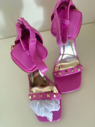 Elegantes sandalias de tacón con un vibrante color rosa y detalles de tachuelas doradas. - Diseño de tiras con detalle de bolsillo. - Tacón fino. - Cierre de pulsera al tobillo.