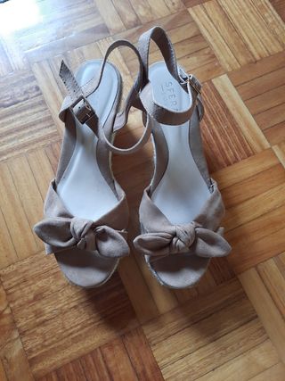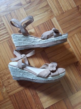 Sandalias con cuña de color marrón claro y dos hebillas. De la marca Massimo Dutti. Se han usado en dos ocasiones. Se realizan envíos