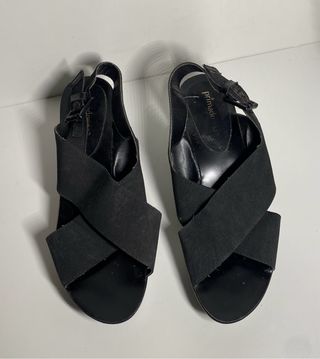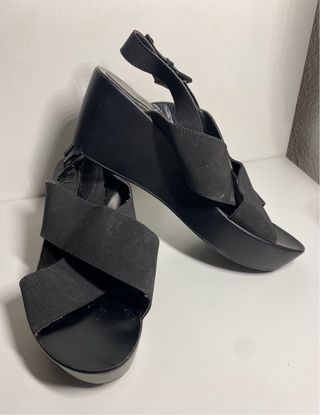 Elegantes sandalias de tacón alto con un diseño de tiras cruzadas. - Material: Ante - Color: Negro - Cierre con hebilla ajustable y elástico - tacón 10 cm, plataforma delantera.5 cm, lo que las hace muy cómodas -la plantilla mide 25.5 cm -usadas 1 vez