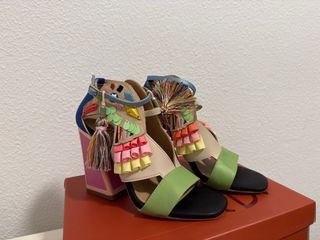 Sandalias de la marca Exe con un diseño vibrante y original. - Detalle de flecos y apliques coloridos. - Tacón grueso con diseño geométrico. - Combinación de colores llamativa. En perfecto estado. Las vendo porque me quedan un poco pequeñas.