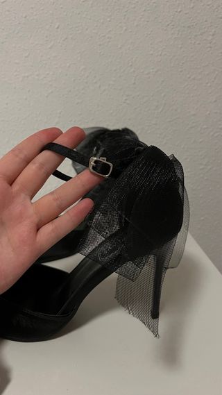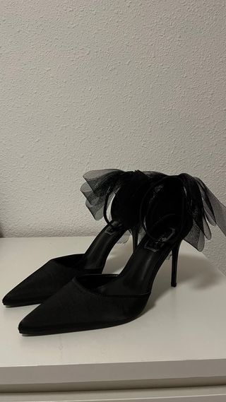 Tacones negros con lazo – Talla 41 Preciosísimos tacones negros de aguja con un delicado lazo en el talón. Un modelo muy femenino, elegante y atemporal. 🆕 Absolutamente nuevos, nunca usados. Los compré exclusivamente para una sesión de fotos en una zona con suelo blando, por lo que estuvieron en los pies menos de una hora y solo en posición sentada 😄 📏 Talla: 41 ✔️ Estado: Nuevos ✔️ Color: Negro ✔️ Detalle: Lazo en el talón Perfectos para ocasiones especiales, eventos o para elevar cualquier look