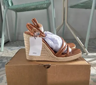 Preciosas cuñas de esparto, con tiras color marrón en simil piel, de Mango. Abrochadas al tobillo. Muy mullida, y cómodas. Me costaron 50€.