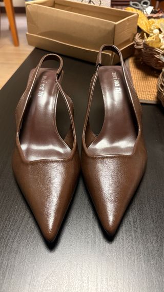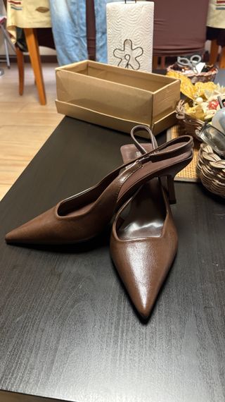 Elegantes tacones stiletto en color marrón con un acabado brillante. El diseño es de punta afilada y el tacón de unos 5 cm. Se vende porque fue un error de talla y no me permiten devolverlo ni cambiarlo - Tacones tipo slingback. - Material con textura brillante.