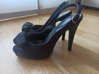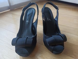 Zapato de fiesta en raso negro. Tacón alto pero bastante cómodo ya que tiene plataforma interior. Talla 35