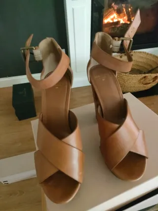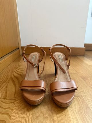 Sandalias de piel camel / marrón de Massimo Dutti puestas en una ocasión. Talla 40. Altura del tacón (contando la plataforma): 11’5 cm. Altura plataforma: 2 cm. Muy cómodas. Perfectas para bodas y eventos.