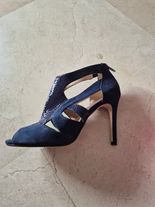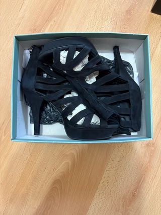 Elegantes sandalias de tacón con tiras. - Material exterior de ante y piel. - Cierre con hebilla. - Tacón 10 cm. y plataforma 2 cm. - En perfecto estado, usadas en un par de ocasiones.