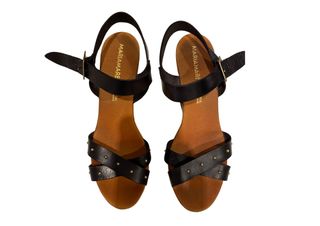 Sandalias de piel con un diseño moderno y elegante. - Material exterior: Piel. - Color: Negro. - Detalles: Tachuelas doradas (Le faltan dos a una sandalia). - Tipo de cierre: Hebilla. - Estilo: Cuña.