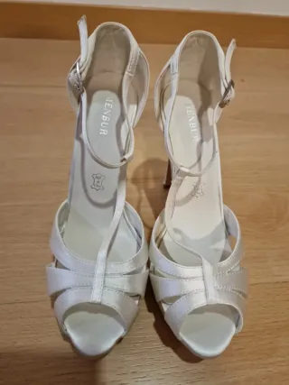 Vendo sandalias de tacón fino, marca Menbur, en color blanco roto. Están sin usar, solo probadas. Elegantes y muy estilosas, ideales para bodas y eventos especiales. Fabricadas en piel y textil tipo tela, con un acabado fino y delicado. Diseño con tiras en el empeine y tira con hebilla en el tobillo para mayor sujeción. Detalle a tener en cuenta: Tienen una pequeña marca de pegamento en la parte interior donde se apoya el pie, no se ve puesta ni afecta al uso (defecto estético mínimo de fábrica). Marca: Menbur Talla: 40 Color: Blanco roto Material: Piel y Textil Tacón: 12,5 cm Plataforma: 3,5 cm Cierre: Tira con hebilla