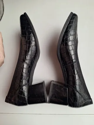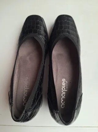 Elegantes zapatos de tacon negros con un diseño texturizado que imita la piel de cocodrilo. Son cómodos y versátiles,calzado confort marca amarpies.Usados solo en un evento. - Acabado brillante. - Detalle elástico en el borde para un mejor ajuste.