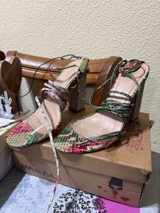 Tacones en talla 38. Presentan un diseño llamativo con estampado de serpiente y detalles brillantes en el tacón. - Tacón grueso con incrustaciones. - Tiras finas para atar al tobillo. - Punta cuadrada. - Diseño multicolor con efecto piel de serpiente.