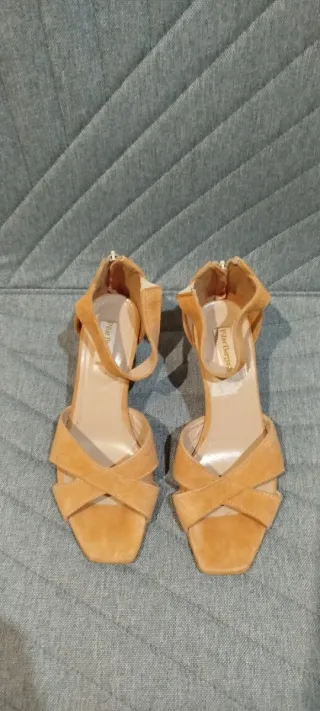 Sandalias de tacón de ante en color beige. Tacón de altura media, son cómodos y elegantes. Tienen poco uso y están en buen estado.