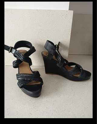 Sandalias MANGO de piel trenzadas negras, tacón 11cm de alto y 3cm de plataforma en forma de cuña. Número 40.