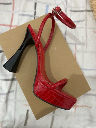 Elegantes tacones rojos con un diseño de plataforma. Nuevos. Los vendo porque quedaron grandes. Me costaron 30€ - Acabado texturizado tipo piel de cocodrilo. - Tira de tobillo con hebilla. - Tacón grueso y curvo.