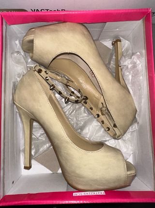 Talla 37. Zapato de tacón beige. Abrochado al tobillo con cinta con tachuelas de pinchitos. Suela interior de piel. Un solo uso, sin marcas internas. Tacón de 12 cms. Se entrega en caja original. Solo envíos.