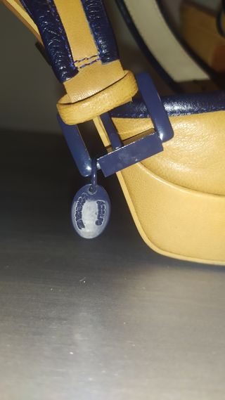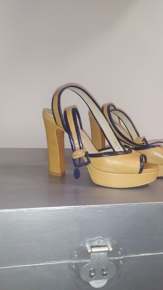 Compradas por 180 euros. Sandalia de diseño de Adolfo Domínguez, usada 1vez, es espectacular y cómoda pese a la altura de su tacón. Realizada en piel de alta calidad, es decir no se trata de eco piel. Es de color Camel y azul marino.El sombreado que se ve en el tacón es una marca simplemente ya que no está dañado el forro del tacón.