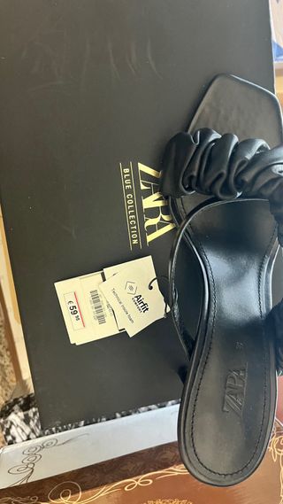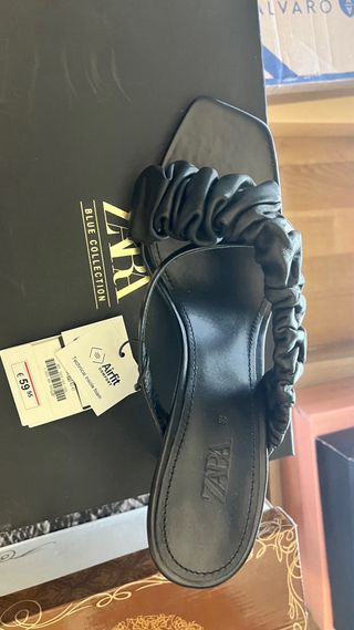 Sandalias de tacón de la marca Mystify. Son de color negro y tienen un diseño elegante y sofisticado. Muy cómodas, no son muy altas. Nuevas con su etiqueta, sin estrenar. Perfectas. - Material: Piel sintética. - Tacón: Medio. - Cierre: Hebilla. - La almohadilla de la suela es muy cómoda y blanda. - El tacón no es de madera, es material tipo PVC imitando a vetas de madera. - No tengo la caja, envío en otra caja. #tacones #zuecos #zuecostacon #zapatos #zapatostacon #sandalias #sandaliatacón