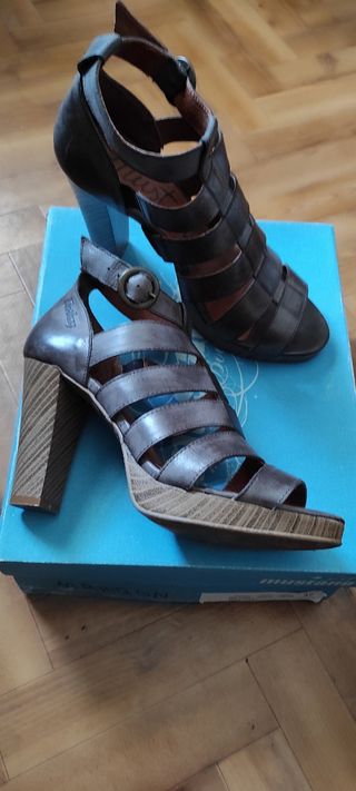 Sandalias piel marrón Mustang tacón 9cm, plataforma 1,5cm. Con 5 tiras de ajuste al pie, por la parte del empeine, por dentro gomas de ajuste, buena sujeción de talón, mediante tira ajustable con hebilla y seis agujeros, para mayor comodidad.