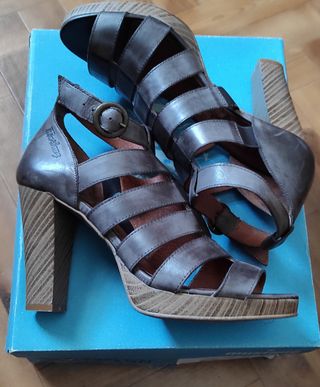 Sandalia piel N- 39, 2 puestas porque realmente me están pequeñas.Compradas en las vacaciones de verano en una tienda de piel de Portugal, por eso no he podido devolverlas.Tacón con la tapa original como se ve apenas desgastada.Hay que tratar la piel con crema como Nivea p.e. para hidratar la parte de la planta por eso está más oscura.Están perfectas y el cordón de raso , no pesan aunque la suela es de madera.Muy buena calidad.Su precio original 65 euros.Largura por dentro 25'5cm , tacón 9cm parte más alta, plataforma parte más ancha 3 cm y 2 cm el resto hasta la puntera.Si interesa alguna prenda más de mi perfil puedo hacer precio