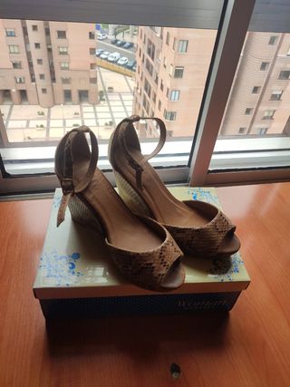 sandalias mujer de auténtica piel usadas solo en una ocasión.El tacón imita al esparto pero no lo es, se puede mojar perfectamente. Están super nuevas .Fabricadas en España