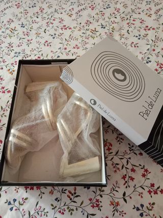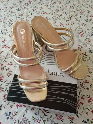 Vendo sandalias de tacón doradas sin estrenar. Talla 39. Tacón de 8cm Marca PIEL DE LUNA de Cristian Lay