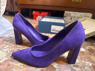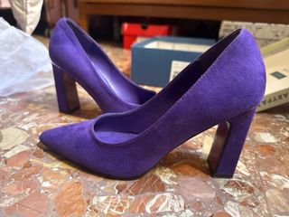 Elegantes tacones morados con un diseño moderno. - Material: Ante - Tacón grueso y cuadrado - Punta fina - Detalle dorado en el talón