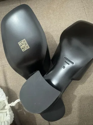 Elegantes sandalias piel de ante negras con plataforma, plantilla interior y suela también de piel. - Tacón grueso. - Tiras finas en la parte delantera. - Cierre de hebilla en el tobillo. - Detalle dorado en la plantilla. - su precio eran de unos 300€