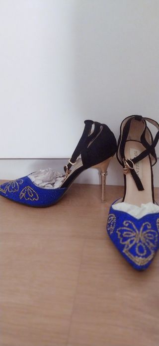 Zapato de tacón de punta con pedrería azul y dorada, ideales para eventos y ocasiones especiales. Usado solo en una ocasión.