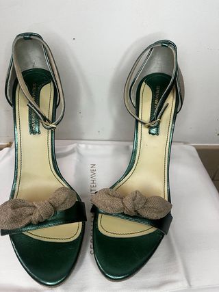Elegantes sandalias de tacón con un acabado metalizado en verde. Presentan un detalle de lazo en tejido natural en la parte delantera. - Cierre de pulsera con hebilla dorada. - Tacón de aguja. - Diseño abierto.