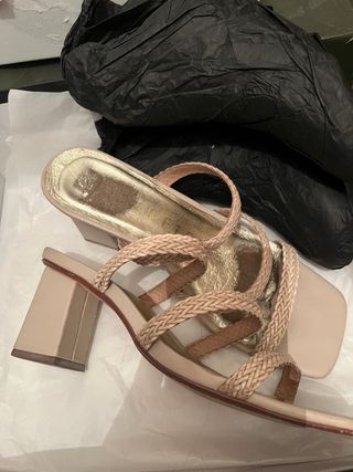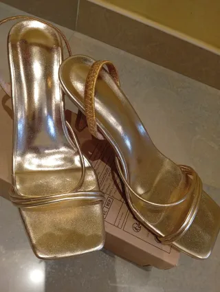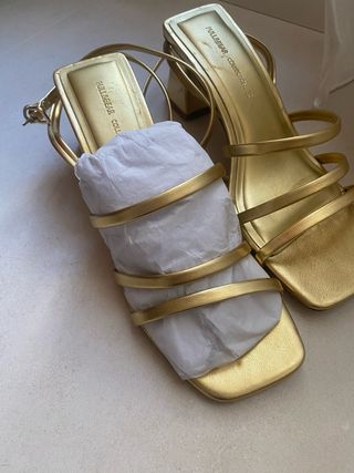 Elegantes sandalias doradas de Zara. - Diseño con tiras entrelazadas en la parte delantera. - Cierre de hebilla en el tobillo. - Tacón fino 10 cm. - Usadas un par de veces, solo se nota en la suela que esta como se ve en la foto. - Talla 39, yo tengo 38 y las he usado.