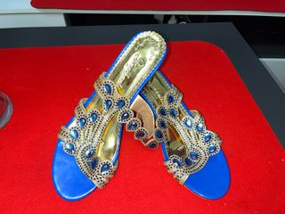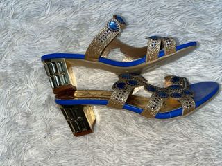 Elegantes sandalias con un diseño llamativo y detalles brillantes. - Tira frontal adornada con pedrería azul y dorada. - Plantilla dorada con logo. - Suela exterior azul.