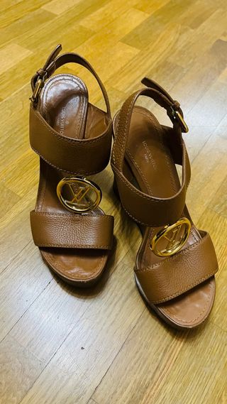 Elegantes sandalias de la marca Louis Vuitton. - Diseño de tiras en color marrón. - Detalle de hebilla dorada con logo. - Tacón de cuña. La suela nueva antideslizante