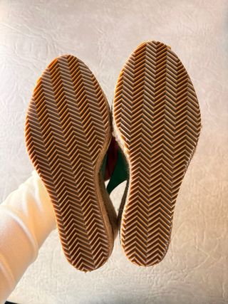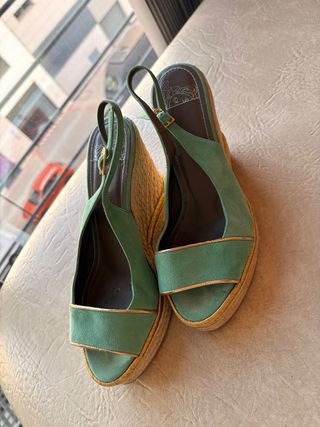 Elegantes cuñas en color dorado, perfectas para añadir un toque de brillo a tu atuendo. - Diseño de cuña con plataforma. - Tiras ajustables al tobillo. - Detalle de esparto en la suela. Obs: tiene salido un poco del brillo en uno, pero es pequeño. Nunca lo he usado, pero creo qye ha sido al transportarlo.