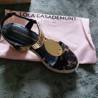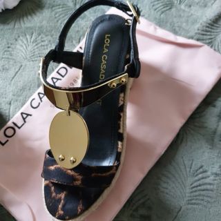 Sandalias de cuña con estampado animal print y detalles dorados. - Tira al tobillo con hebilla. - Adorno metálico ovalado en la pala. - Plataforma forrada de esparto. - Solo puestas una vez para una boda